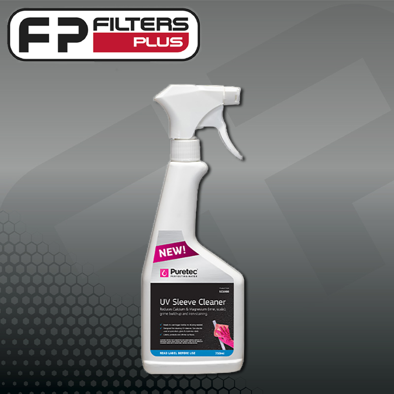 Wearing protective clothing remove the UV sleeve from the chamber according to the manufacturer’s instructions. Wet the surface to be cleaned before applying the scale cleaner. Spray the sleeve with a generous coating of scale cleaner, making sure liquid is sprayed away from eyes and bare skin. Use a soft wet cloth to clean the sleeve. Once the sleeve is free from scale, rinse and dry thoroughly with a clean cloth.